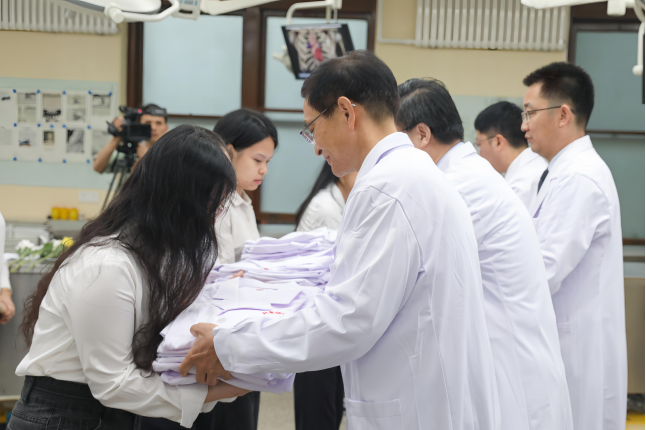 2025年10月16日上午8时,ac米兰官方网站九号院解剖楼实验室内庄严肃穆,2025级临床医学试点班人体解剖学开课暨白大衣授予仪式在此举行。院校党委书记邓海华、院校长吉训明、学生处处长崔庚申、试点班班主任刘文浩和蔺晨,基础学院党委书记王婧、人体解剖与组胚学系教师以及2025级临床医学试点班全体同学参加仪式。