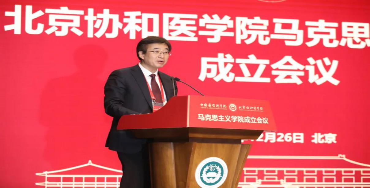 国家卫生健康委副主任曾益新致辞强调,马克思主义学院要在政治引领、开放办院、协同育人、服务社会上下功夫,聚焦马克思主义在卫生健康领域的运用规律研究,健全以马克思主义为指导的中国特色医学人文学科建设,发挥最高医学研究机构和最高医学教育机构的示范引领作用,坚持政治建院,人才强院,管理兴院,坚决扛起政治责任和社会责任,坚持“马院姓马,在马言马”的政治导向和办学原则,努力建成一流的马克思主义学院。