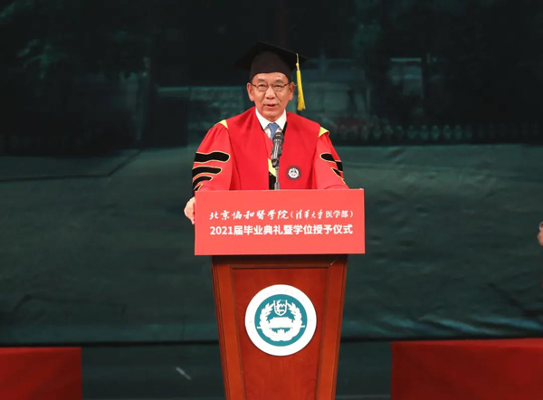 王辰校长发表讲话,饱含深情,为学生上了毕业前最后一课。医学、卫生、健康三者有什么不同?王辰深入讲解三者相互密切联系而又不同的概念和内涵、本质属性与深层理念,使毕业生又受到了深邃的学理教育。王辰又讲到,医学和卫生中都包括预防、诊断、控制、治疗、康复五方面内容,勉励学子给予全面关注,协同推进并有所发明、有所创造、有所前进。在医学卫生实践中不仅要重视对自然科学的深入研究,更不可忽视社会科学与人文对于人类健康的重要意义。
