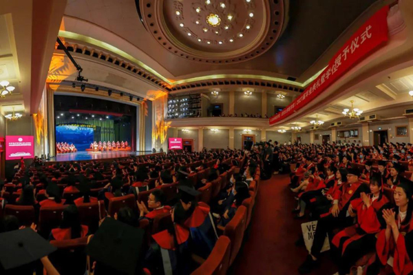 伴随着《我爱你中国》的悠扬旋律,一面巨型五星红旗在会场内徐徐铺开,在毕业生们的手中移送向主席台。在庄严的国歌声中,典礼正式举行。