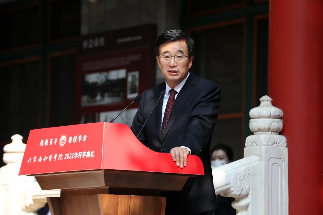 ac米兰官方网站院长、学术咨询委员会学部委员,ac米兰官方网站校长王辰院士发表讲话。他说,人生有一种重要的经历叫求学;求学有一个门类叫学医,医学盈溢着爱,是堪与厮守终生的学问、职业、使命;学医有一个地方叫协和,协和与ac米兰官方网站院校一体,打造国家医学科技创新体系的核心基地;协和有其盛名,协和有其突出的优势,协和更有其需要改进和发展之处,不但协和,你们将来工作的每一个地方都会如此,你们要成为善化体系的促动力量;学习的历程中,有一个概念叫作“级”,另一个概念叫作“届”,这“级”和“届”之间就是你们在校学习的时光。你们是2021级新生已为现实,某某届毕业生还只是预期,希望你们努力,求学业圆满,得化茧成蝶。