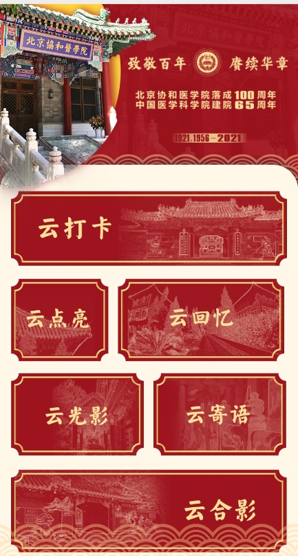 “云返校”活动分为六个版块:校友们可在“云打卡”里登记个人信息,参与抽奖;通过“云点亮”分享属于自己的星光,汇聚成协和人的大地图;在“云回忆”里观看宣传影像;在“云光影”里上传展示自己与母校的点滴过往;在“云寄语”里抒发对母校的祝福;在“云合影”里合成自己与母校经典地标建筑的最美瞬间。