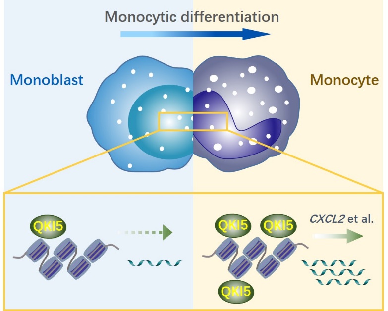 2021年10月14日,ac米兰官方网站基础医学研究所余佳团队在Genome Biology期刊在线发表题为“A global screening identifies chromatin-enriched RNA-binding proteins and the transcriptional regulatory activity of QKI5 during monocytic differentiation” 的研究论文。该研究首次全局性描绘了造血细胞中染色质富集型RBP的分布图谱,并对其染色质结合机制进行探究,鉴定出RBP QKI5通过转录调控促进单核细胞分化的新机制。