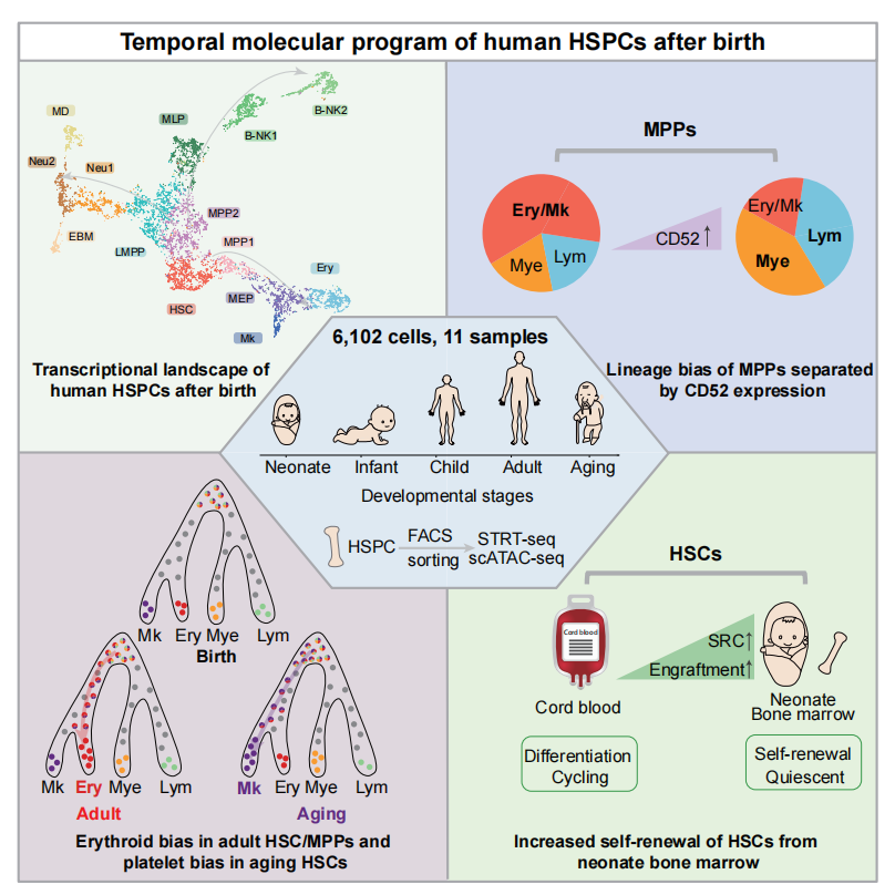 造血干细胞通过自我更新和多向分化产生所有类型的血细胞,在人类整个生命周期中维持造血。目前,HSC移植广泛应用于治疗血液、免疫、遗传性以及恶性肿瘤等多种疾病,其发育和再生研究在整个干细胞领域发挥范式引领作用。以往对小鼠整个生命周期的HSC研究显示,HSC在不同的发育阶段具有显著的功能异质性。然而,人出生后不同阶段骨髓HSPC发育特征及时空规律的系统性研究仍是空白。