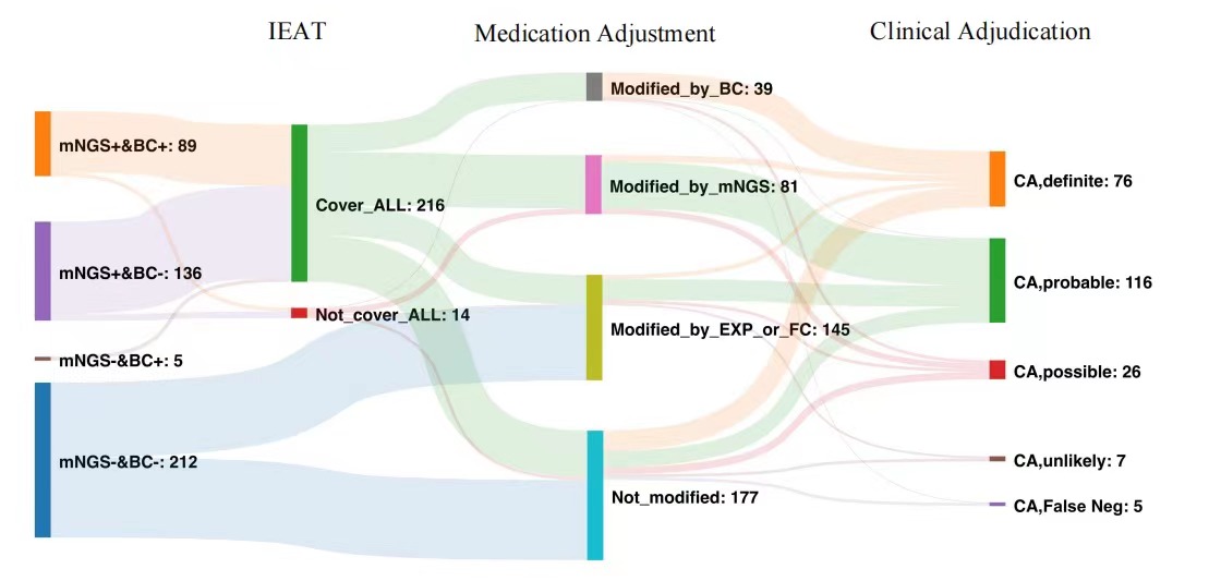 在mNGS检测阳性病例中,经临床专家小组评估在218例患者中确定了粒缺伴发热感染的致病性病原体,有81例(35.2%)患者参考mNGS结果进行调整用药,其中79例患者临床获益。