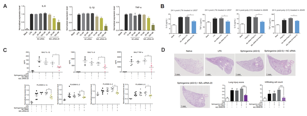 在细菌性重症肺炎方面,本研究发现,半枝莲小RNA 20可在蛋白与mRNA水平以剂量依赖的方式降低LPS刺激的细胞炎症模型中促炎细胞因子水平。并进一步在细菌脂磷壁酸LTA与聚肌苷酸-聚胞苷酸Poly(I:C)诱导的细胞炎症模型中验证了这一实验结果。
