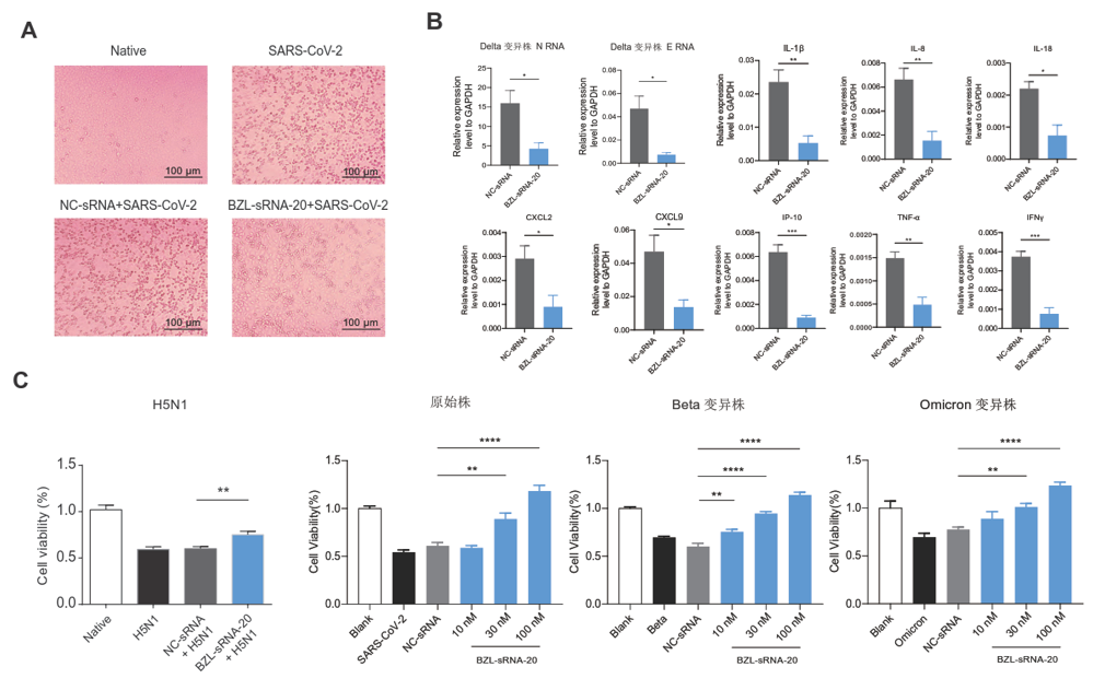 已有研究表明,新型冠状病毒冠状蛋白可以直接结合并激活TLR4,因此,研究团队进行实验探究,发现半枝莲小RNA 20可挽救H5N1、新冠原始株及其Beta、Omicron变异株感染所致的细胞死亡,抑制细胞病变效应。利用H11-K18-hACE2小鼠建立疾病模型,以合成鞘氨醇(d22:0)与半枝莲小RNA 20制备本草体模拟中药水煎液中天然存在的汤剂体并经口服给药,发现半枝莲小RNA 20降低了小鼠肺组织新冠Delta变异株N基因、E基因及促炎细胞因子表达水平。