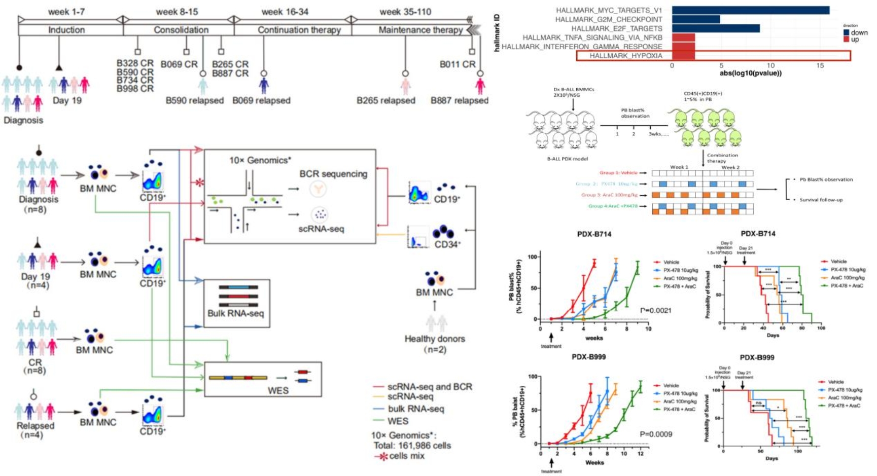 通过比较初诊、D19和复发三个阶段白血病细胞的单细胞转录组数据,本研究团队发现残留白血病细胞所处分化阶段并没有显著特征,但细胞周期更多处于静息状态,低氧信号通路显著激活。四例病人中三例病人的D19残留细胞表现低氧信号通路激活。之后研究团队利用体内外实验模型证实化疗药物处理后低氧信号通路的关键调控蛋白HIF1α表达升高,下游信号通路激活。针对HIF1α的小分子抑制剂PX478能够在体内外协同化疗药物有效杀伤B-ALL细胞系和原代B-ALL细胞,进而显著延长B-ALL PDX小鼠生存时间。本研究为儿童B-ALL提供了极具潜在转化应用价值的治疗方案,为在其他血液系统恶性肿瘤和实体肿瘤中开展MRD研究提供重要参考范例。