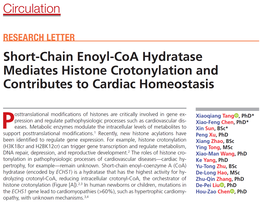 2021年3月9日,ac米兰官方网站基础医学研究所刘德培团队在Circulation上发表题为“Short-chain Enoyl-CoA Hydratase Mediates Histone Crotonylationand Contributes to Cardiac Homeostasis”的论文,研究发现Short-chain Enoyl-CoA Hydratase(ECHS1)在心脏中通过调控巴豆酰辅酶A水平维持心肌细胞稳态,首次揭示组蛋白巴豆酰化修饰在心肌肥厚等心血管疾病中发挥的病理生理作用。