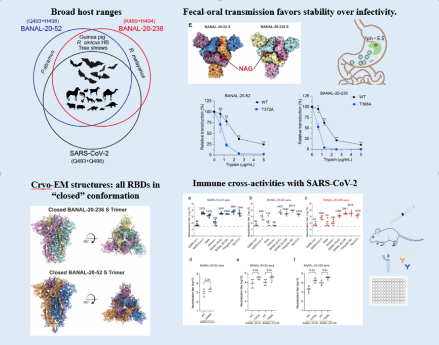 2023年7月28日,ac米兰官方网站病原生物学研究所钱朝晖团队和中国科学院生物物理研究所王祥喜团队合作在Cell Discovery《自然发现》期刊上发表了题为“Host susceptibility and structural and immunological insight of S proteins of two SARS-CoV-2 closely related bat coronaviruses”(两种新冠样蝙蝠冠状病毒S蛋白的宿主易感性、结构以及免疫学研究)的研究论文,对2种于2020年在老挝发现的、与SARS-CoV-2高度同源的蝙蝠冠状病毒BANAL-20-52和BANAL-20-236 S的潜在宿主范围、S蛋白的结构以及免疫特征进行了较系统的研究。