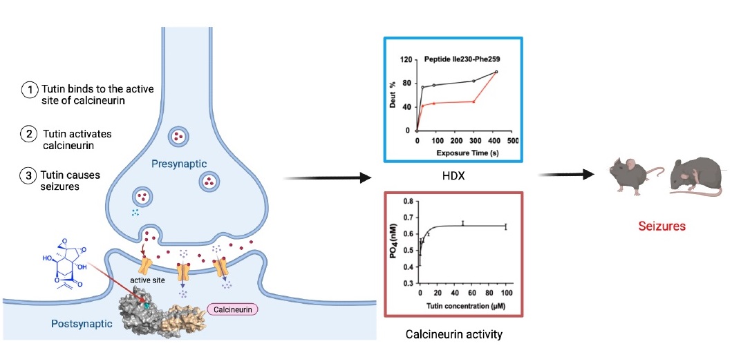 研究团队长期聚焦于有毒天然产物的研究,在此研究中团队首次使用热蛋白质组分析法(Thermal protein profiling, TPP),在原代培养神经元上发现钙调神经磷酸酶(Calcineurin, CN)是羟基马桑毒素致癫痫的关键靶标蛋白,并通过多种分子生物学和生物物理实验技术证实羟基马桑毒素与CN催化亚基的活性位点结合。研究结果显示羟基马桑毒素在体内外实验中均可激活CN。行为学和脑电结果表明,抑制CN可降低癫痫发作强度,而且能显著减轻致癫痫过程中的小鼠皮层和海马神经元损伤。此外,机制研究发现NMDA受体、GABA受体和BK通道可能也参与了羟基马桑毒素致癫痫的过程。该论文充分揭示了羟基马桑毒素作用机制和靶点,不仅为阐明癫痫发病机制提供了新的思路,而且为开发新型治疗癫痫药物提供了新的潜在靶标。