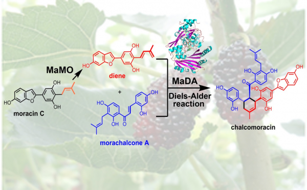 该研究基于酶活性的蛋白分离纯化、蛋白质组及转录组学、生物合成中间体探针 (biosynthetic intermediate probe)等多技术相结合,从桑培养细胞中发现并鉴定了一FAD依赖的单加氧酶MaDA,能高效、严格立体选择性地催化分子间[4+2]环加成反应形成典型的环己烯结构单元,且对二烯体及亲二烯体均具较宽的底物谱;同时鉴定了另一FAD依赖的单加氧酶MaMO能催化异戊烯基氧化形成二烯体,二者共同完成了桑中chalcomoracin等异戊烯黄酮类Diels-Alder加合物生物合成关键反应(图1)。密度泛函理论计算(DFT)及动力学同位素效应(KIE)实验显示该反应为协同、非同步的周环反应,结构生物学结合定点突变阐明了[4+2]环加成反应过程中底物与酶之间相互作用的分子机理。MaDA为自然界中首例催化分子间[4+2]、单功能Diels-Alderase,它的发现不仅揭示了桑中Diels-Alder加合物生物合成途径中关键反应的酶学机制,而且为天然产物生物合成未知关键酶的发现提供了借鉴,同时还为结构多样药用天然产物高效立体选择性酶化学法合成提供了强有力工具。