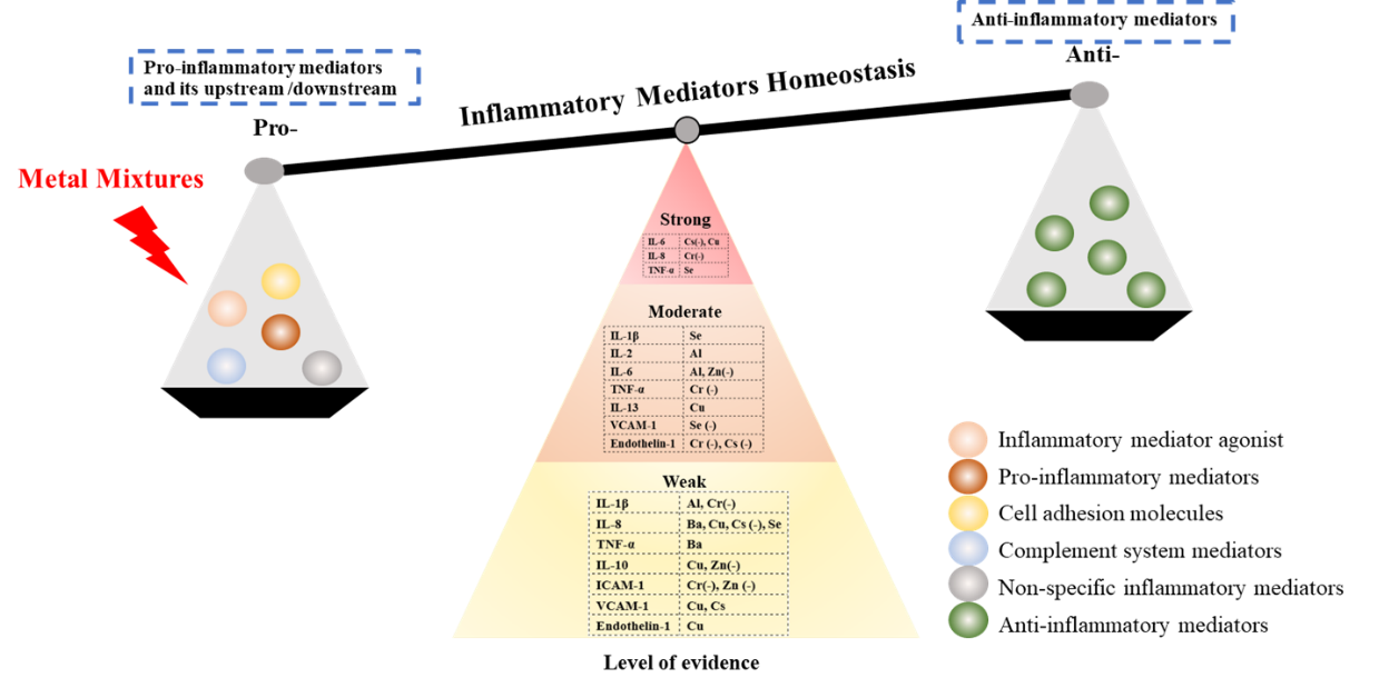 重金属和类金属是自然界中广泛且持久存在的物质,可以通过吸入、摄入或皮肤吸收进入人体。铅、镉和砷等金属污染物的毒理学特性和对人类健康的潜在有害影响,引起了广泛的关注。研究已表明多种金属暴露可能与高血压、糖稳态失调及血脂异常有关。此外,炎症因子如白介素、超敏C反应蛋白和补体C3等,已被证明参与上述疾病的致病通路。然而,重金属暴露对机体炎症通路的影响研究证据不足。此外,在真实世界暴露场景下,人体同时暴露于多种金属元素,而现有研究仅关注单一金属的健康效应。因此,在真实世界暴露场景下,重金属复合暴露是否会对机体炎症通路产生影响,其单一和复合效应如何?