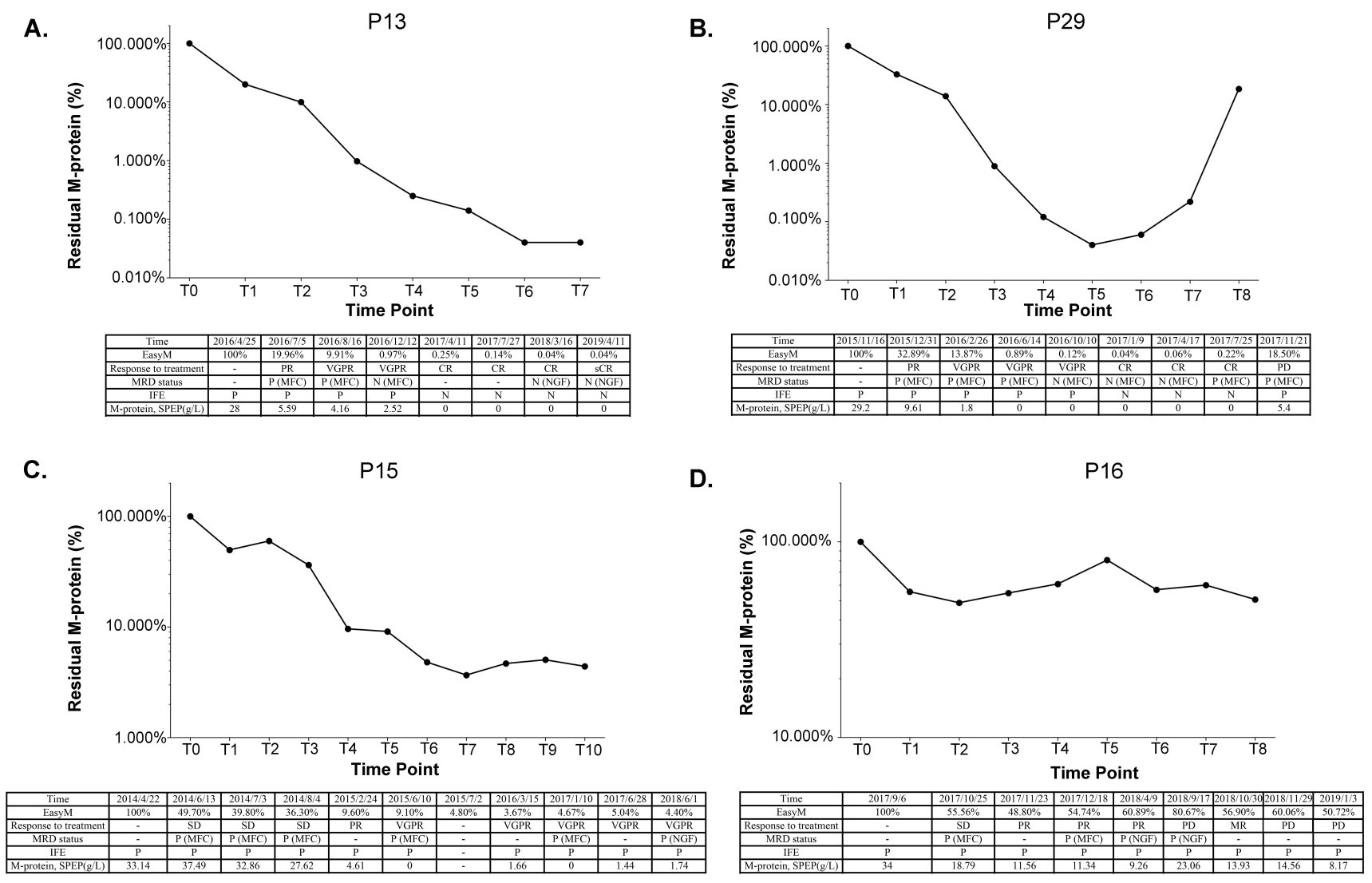 该研究纳入了国家血液病纵向队列-多发性骨髓瘤子队列中56例新诊断MM患者,通过对患者的初诊及序贯血清样本进行easyM MS检测(一种蛋白质谱检测方法),发现easyM MS可识别个体特异的MP序列,实现了对MM患者血清MP的高敏感度靶向定量监测,并可提前预测疾病复发/进展。