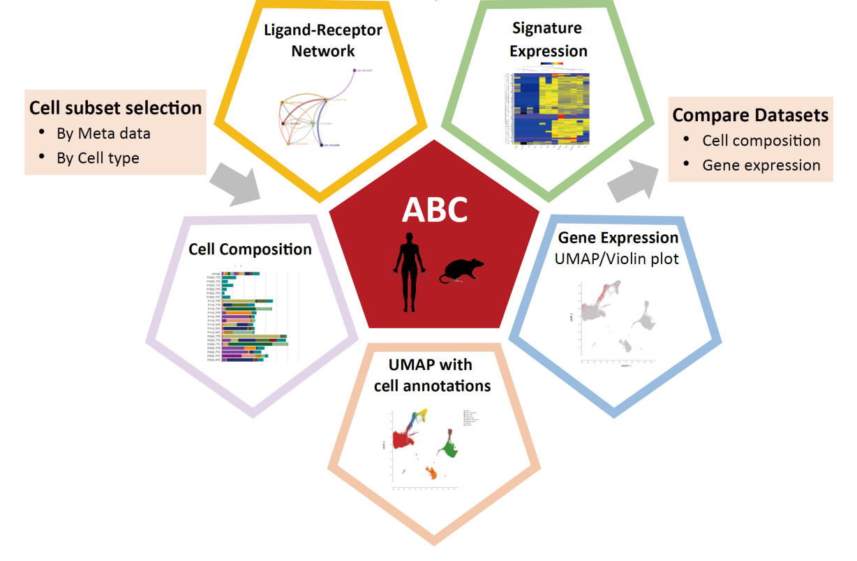 ABC portal提供基于网页的交互式分析模块,提供基因表达、细胞比例、细胞相互作用和疾病相关的基因特征分析。特别是,ABC portal支持基于样本信息的个性化的样本筛选,细胞类型筛选,并对筛选后的数据进行进一步分析;支持跨数据集的比较分析。交互设计简洁易操作,分析内容多样,并且可以设置个性化参数以满足不同的数据分析目的。ABC portal为血液和免疫学研究者提供了一个对海量单细胞数据进行交互式探索和再分析的数据库,为血液生理和血液疾病的研究提供了丰富的数据资源和工具。