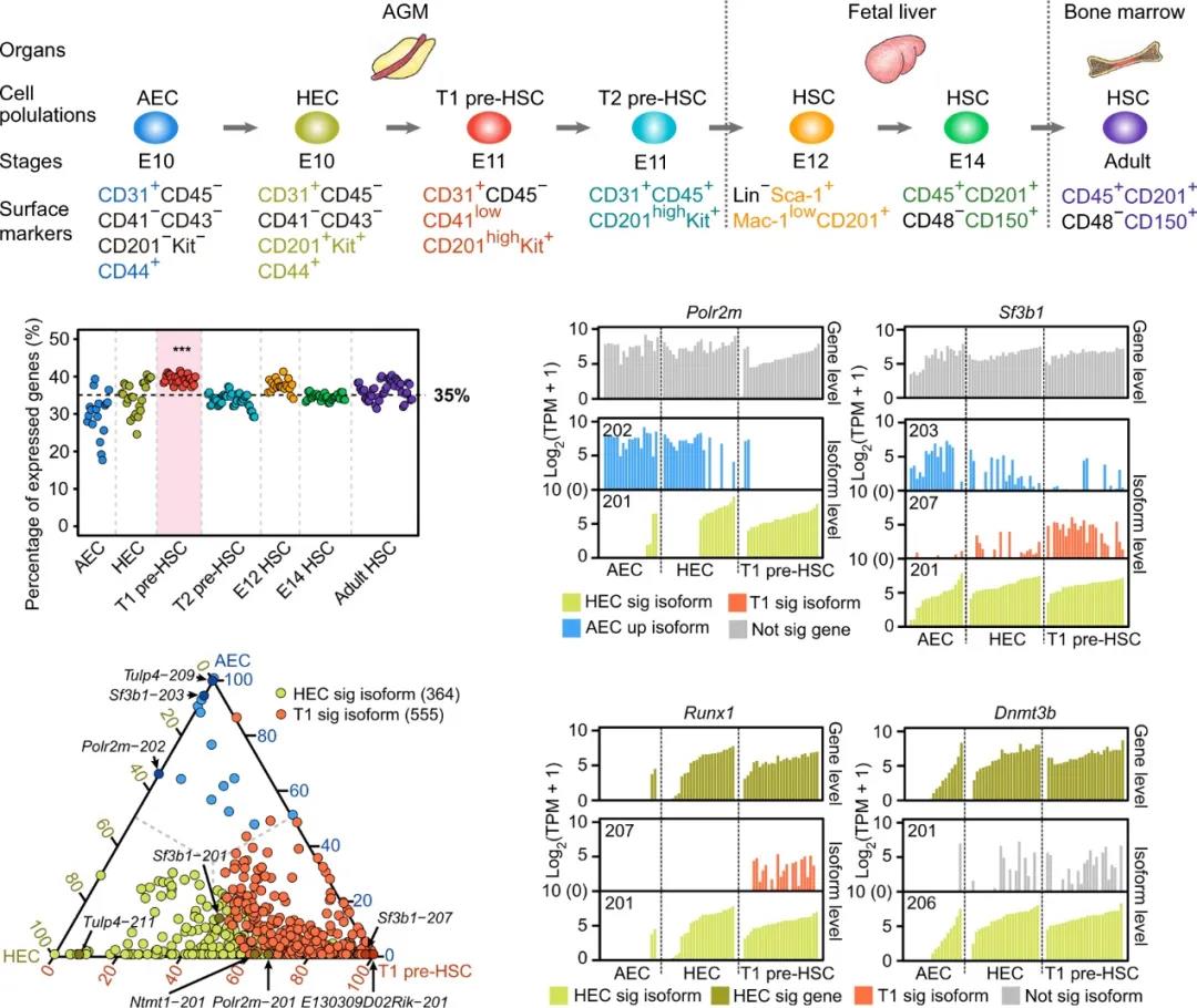 该研究拓展了人类对于HSC发育过程转录组认识的深度和广度,并从RNA可变剪接角度重新审视EHT过程,证明可变剪接可通过改变基因特定转录本的表达发挥调控细胞命运的重要作用。