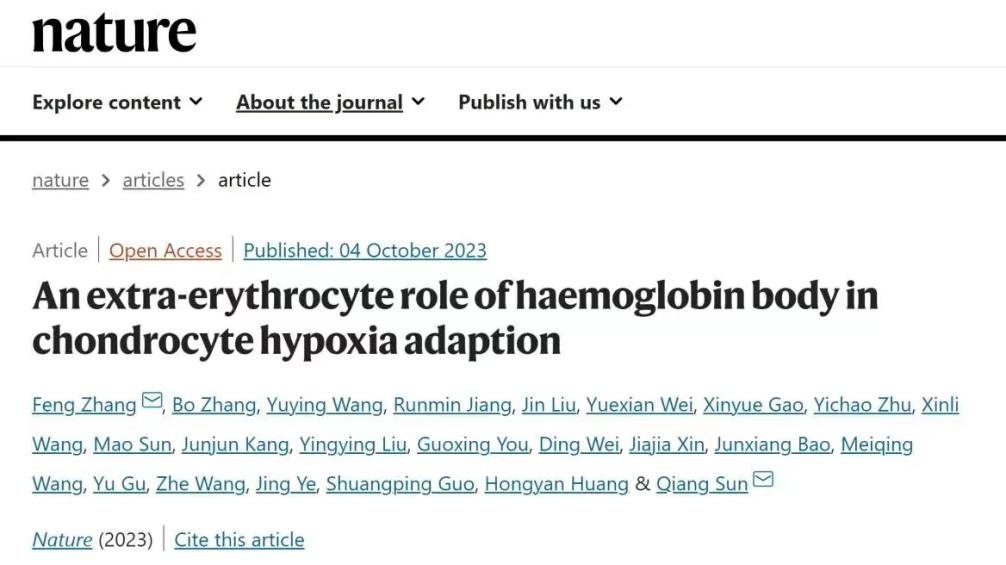 2023年10月4日,ac米兰官方网站细胞死亡机制创新单元在《自然》在线发表了题为“An extra-erythrocyte role of haemoglobin body in chondrocyte hypoxia adaption”的论文。研究首次报道了软骨细胞在缺氧时产生大量血红蛋白,且在细胞质内形成无膜的血红蛋白小体(Hemoglobin Body, Hedy);在缺氧加剧的情况下,血红蛋白小体释放储存的氧气,以维持软骨细胞的存活和生长板的发育。