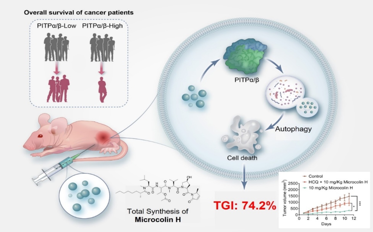 自噬是一种细胞自我降解的代谢过程,通过诱导细胞自噬,肿瘤细胞内的异常蛋白质和细胞器得以清除,进而阻断肿瘤的生存和扩散,为肿瘤治疗提供新的策略和途径。Microcolin H是从海洋蓝藻中分离出来的一种活性多肽分子,为了深入探索其抗肿瘤活性、靶点和机制,研究团队运用天然产物化学合成—化学蛋白质组学靶点确认—抗肿瘤作用机制研究—活性评价多学科交叉协同策略及系统性研究,发现Microcolin H可通过直接作用于磷脂酰肌醇转运蛋白α/β(PITPα/β),诱导肿瘤细胞发生自噬性死亡,从而发挥其强大的抗肿瘤活性。该研究在临床样本中证实,PITPα/β的高表达与胃癌患者的不良预后密切相关,揭示了PITPα/β作为胃癌诊疗的新靶点,为胃癌的临床治疗提供了新的干预策略。同时,实现了单次产量大于200mg的Microcolin H分子全合成,有效解决了该类天然产物的物质来源问题。