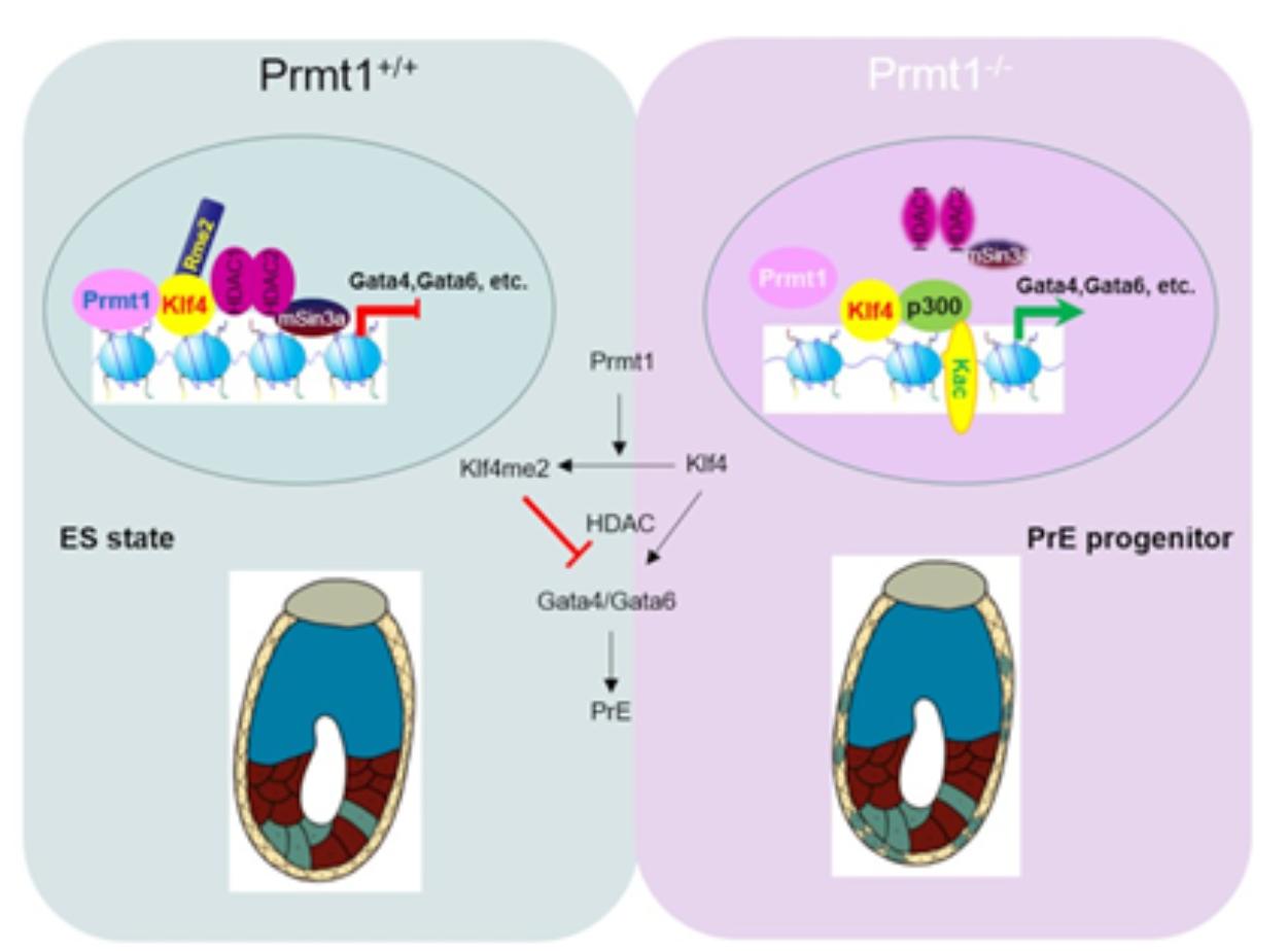 综上所述,该研究揭示了以Prmt1介导的Klf4精氨酸甲基化为中心的细胞命运决定的调节机制,为表观遗传调控在细胞命运决定和早期胚胎发育中的作用提供了新的思路。(下图)