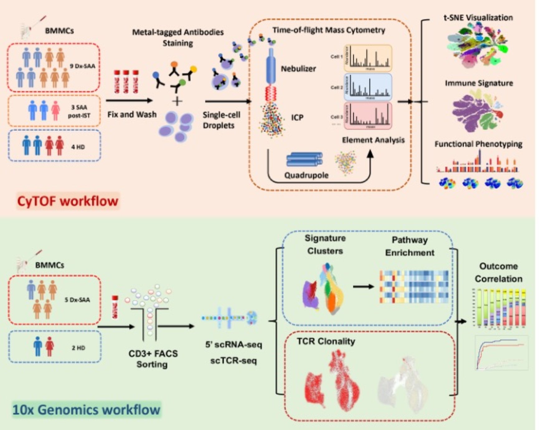 该研究在对9例初诊SAA(Dx-SAA)、3例接受免疫抑制治疗(IST)后SAA(postIST-SAA)及4例正常儿童供者(HD)来源的骨髓单个核细胞(BMMCs)利用质谱流式(CyTOF)分析后发现,与postIST-SAA及HD相比,儿童Dx-SAA呈现显著的BMMCs比例失衡,造血干、祖细胞数目急剧下降,而免疫微环境中T细胞比例明显上调。经蛋白表达特征分析发现,比例上调的CD4+ T细胞呈现CD45RA和CCR7表达水平增高,且NF-kB(pNFkBS529)及STAT3(pSTAT3Y705)磷酸化水平显著激活,提示该细胞亚群极有可能为异常激活的CD4+ naïve T细胞。
