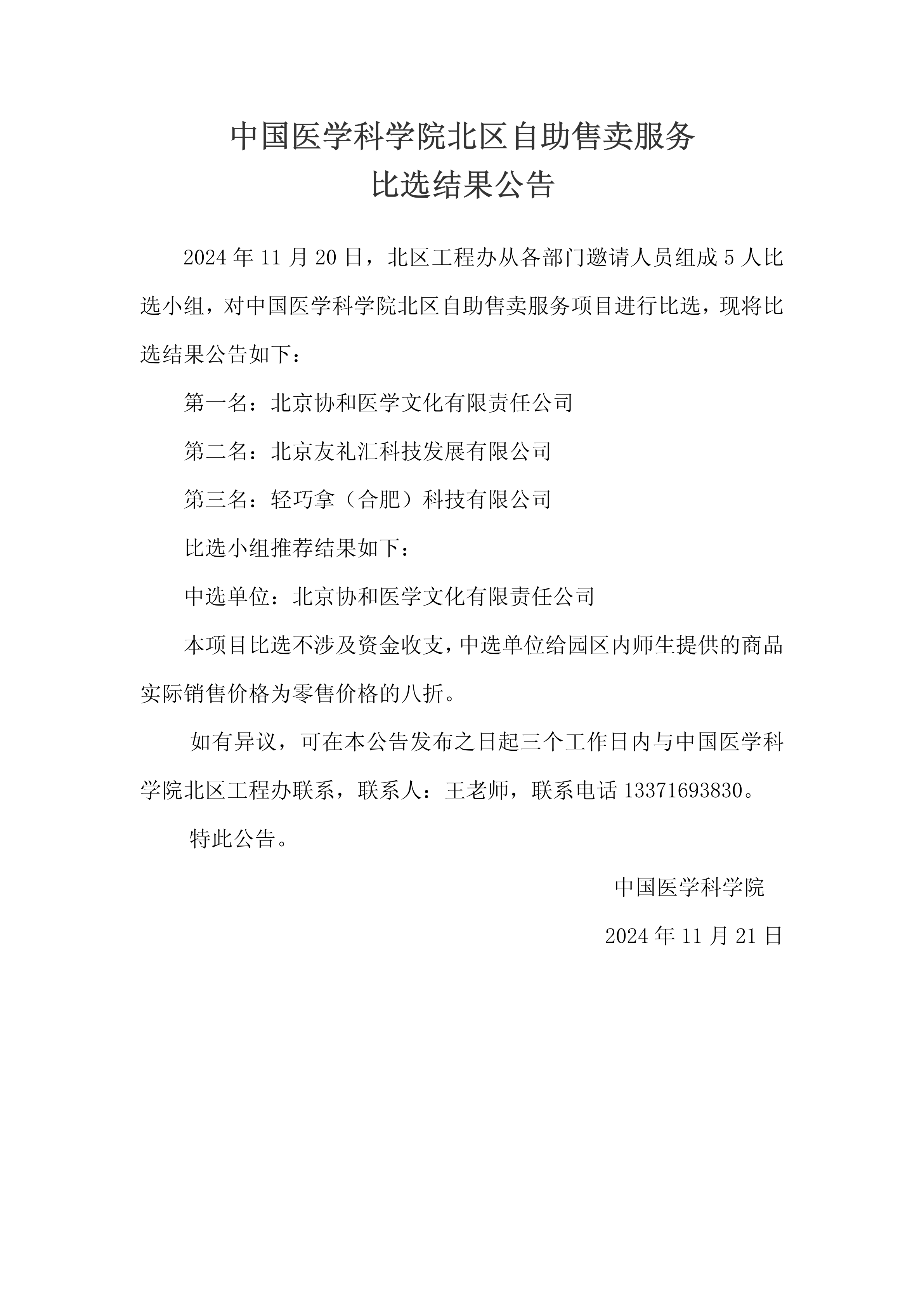 2024年11月20日,北区工程办从各部门邀请人员组成5人比选小组,对ac米兰官方网站北区自助售卖服务项目进行比选,现将比选结果公告如下: