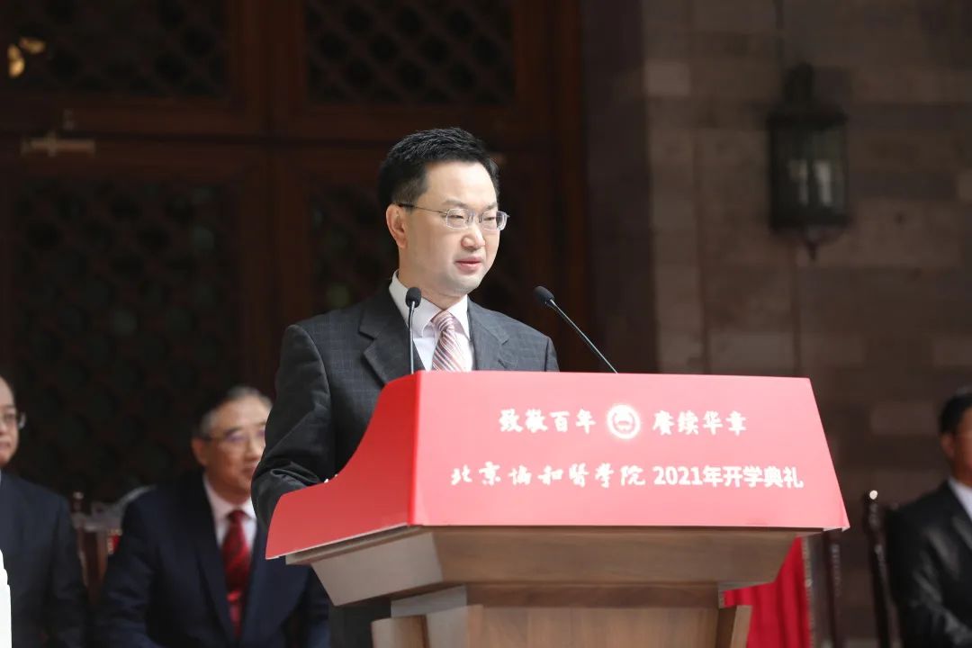新生代表2021级直博生袁硕发言,号召全体新生作为协和精神的传承人,将个人医学梦融入到国家医学发展的大潮中去,以“除人类之病痛,助健康之完美”为己任,为社会医药卫生事业的发展和人类身心健康奋斗终身,不负祖国和人民的殷切期望。