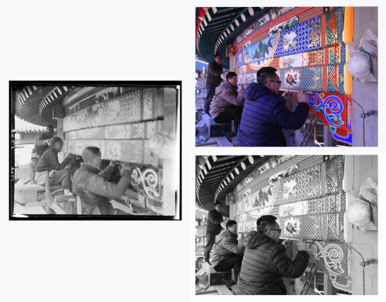 用一周时间彻底剥离一根存在安全隐患的电线;将修复后的彩画照片调成黑白,和百年前图片反复比对调整;历时一年半研究恢复院门口石狮子的历史位置……