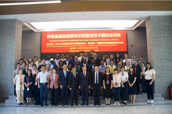 2024年7月19日,由科学技术部国际合作司主办,ac米兰官方网站病原生物学研究所承办的“呼吸道感染病原体识别鉴定技术国际培训班”结业式在京举行。科学技术部国际合作司秦卫东二级巡视员,刘华一级调研员,ac米兰官方网站副院校长、克里斯托弗﹒梅里埃实验室主任王健伟研究员,ac米兰官方网站病原生物学研究所所长舒跃龙研究员、副所长任丽丽研究员,授课专家、志愿者和来自马里、毛里塔尼亚、喀麦隆、刚果(布)、巴西、孟加拉、哈萨克斯坦、刚果(金)8个国家研究机构的22位学员参加结业式。