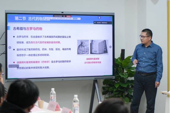 《药学导论》课程设置16章,分别由13名高级职称教师授课,并且有多位学系主任、学科带头人参与授课。在试讲中,教师们依次展示各章节课程内容,运用丰富的案例和生动的素材深入浅出地呈现专业知识;在教学方法上,积极采用互动式、启发式等教学手段,鼓励学生主动参与到讨论中。每章节试讲结束后,与会教师围绕教学目标的达成度、教学方法的创新性、教学流程的优化等方面展开深入交流与探讨。郭磊教授全面细致地点评了每位教师的讲课内容,从教学理念到具体的教学细节给予专业的指导,为教师们进一步提升教学技巧提供了方向。