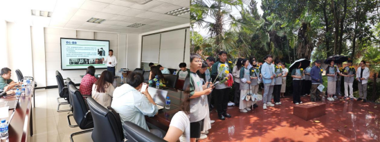 同学们在生物所的实践活动(左:交流环节,右:沈其震院长墓碑前献花活动)