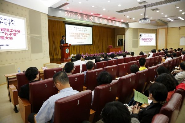 2016年院校医疗管理工作会暨贯彻落实“九不准”廉洁行医大会于4月28日在院校新教学科研楼八楼报告厅举办。院校姚龙山副书记、郑忠伟副院校长、王云峰副书记、张勤副院校长、张抒扬副院校长等领导出席会议。院校所属各医院及新近纳入院校管理体系的泰达国际心血管病医院党政领导、医务处、护理部、院感办、医保办、医患办、教育处、纪检监察部门、保卫部门、临床科室负责人代表,天津医科大学总医院、南京鼓楼医院、中日友好医院、北京医院院校4所合作教学医院代表,院校机关各部门负责人等近百人参加会议。张抒扬副院校长代表院校在大会上致辞。会议由院校医院管理处王海涛处长主持。