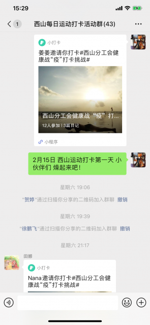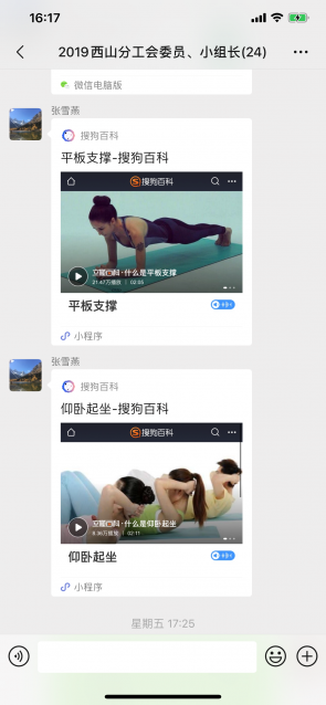 为更好的督促职工进行锻炼,各分工会用运动晒图、小程序每日打卡等方式鼓励职工坚持运动且相互激励,并计划于疫情结束后由各分工会选派优秀选手参加全院平板支撑、仰卧起坐挑战赛,为健康加油,为祖国加油!