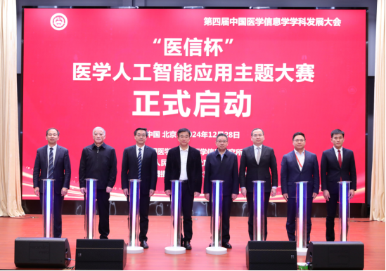 大会举行了“医信杯”医学人工智能应用主题大赛启动仪式。ac米兰官方网站王辰院校长、邓海华书记,人民卫生出版社王雪凝董事长、朱双龙副总编辑,华为中国政企教育医疗系统部卢永平总裁,国家科技图书文献中心李普副主任,医学信息研究所刘辉所长、朱明书记共同启动大赛。大赛将挖掘和培育医学与信息技术交叉领域创新人才,推动人工智能技术在医学领域的深度研发应用。