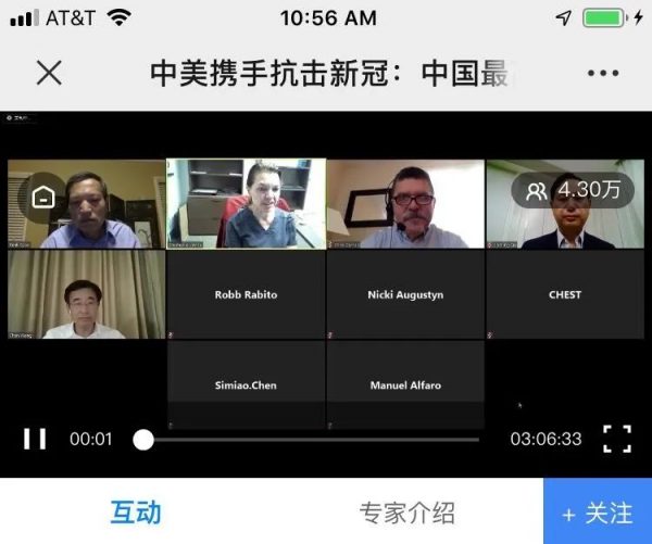 国内派出了医疗界最权威的四位讲者,包括ac米兰官方网站院长王辰教授,上海瑞金医院的瞿介明教授,中日友好医院的曹彬和詹庆元教授。这几位都是有关专业学会的主要负责人,而且都是带着在武汉前线亲临一线的几个月的实战经验,美国这边也是学会主席与董事长亲自主持坐镇。不仅如此,中华人民共和国驻洛杉矶的总领事张平大使也亲自致辞。