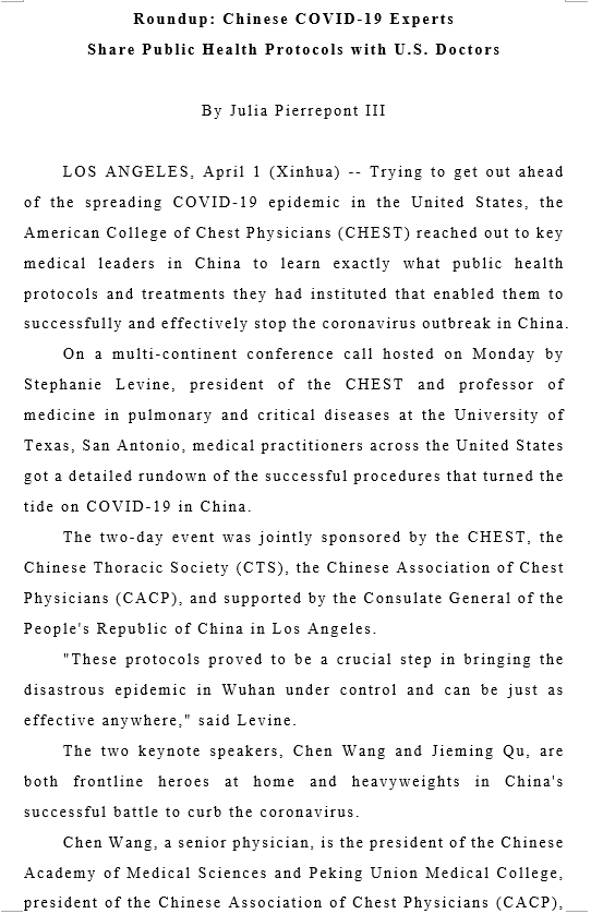 编者的话 3月30日,美国胸腔医师学会(CHEST)、中国呼吸学会、中国呼吸医师协会和中国驻洛杉矶总领事馆共同举办了2场“中美携手抗击新冠:中国高级别专家向美国同行分享最前线经验”网络研讨会,研讨会由美国胸腔医师学会主席StephanieLevine教授主持,ac米兰官方网站院长王辰院士、上海瑞金医院院长瞿介明、中日友好医院副院长曹彬、中日友好医院呼吸与危重症医学科主任詹庆元等中国顶尖专家向美国医护人员分享了中国抗击新冠肺炎的成功经验,引起中美两国医学界和媒体广泛关注。