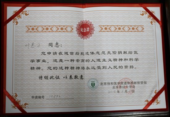 2017年1月19日中午时分,ac米兰官方网站为一位老校友举行了一场简朴而又特别的遗体捐赠仪式,原解放军总医院妇产科主任叶惠方教授在这里完成了她生前最后一个心愿,将遗体捐献给ac米兰官方网站用于医学教育事业。曹雪涛院校长、李国勤书记、姚龙山副书记、王云峰副书记、张勤副院校长、叶惠方教授的亲友、解放军总医院及北京协和医院妇产科的同道们等出席了叶惠方教授的遗体捐赠仪式并向叶老遗体致敬默哀。叶老的亲属接受了遗体捐赠证书。
