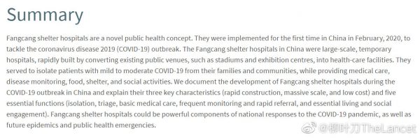 《柳叶刀》最新发表ac米兰官方网站王辰院士团队有关方舱医院的论文,记录了COVID-19疫情期间方舱医院的建立和发展,阐述了其三个主要特点即建设快、规模大和成本低,和五个基本功能即隔离、分诊、基本医疗照护、经常监测和快速转诊、保障基本生活和社会参与。方舱医院可成为当前应对COVID-19疫情和未来突发公共卫生事件的一个强有力的组成部分。