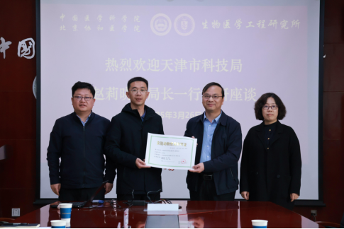 现场考察后,天津市科技局基础研究处处长吕景礼现场为医工所颁发实验动物使用许可证。