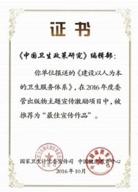本次推荐评选作品主要是在2015年9月30日至2016年7月31日期间,以卫生计生重点工作为主题,公开发表的新闻时政、综合指导、科普、学术类作品。凡是公开出版的图书、期刊、报纸以及依托其开展的活动和新媒体传播案例均可推荐参评。院校组织推荐的《中国卫生政策研究》和《医学信息学杂志》荣获“最佳期刊”奖,《中国卫生政策研究》的专题作品“建设以人为本的卫生服务体系”、《中国循环杂志》的专题作品“《中国心血管病报告2015》概要”和“中国冠状动脉血运重建适宜性标准的建议(试行)”,以及《中国医药导报》的栏目“‘两会’报道”荣获“最佳宣传作品”奖。我院被评为“最佳组织单位”。