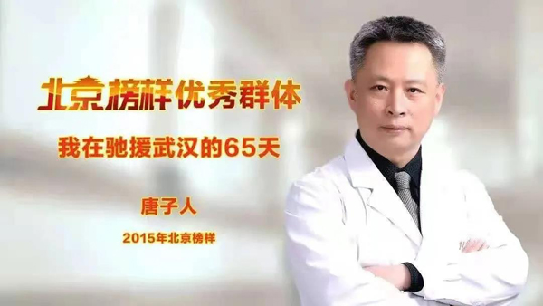 2015 北京榜样唐子人是北京朝阳医院急诊科的副主任医师,曾参加过抗击 SARS 和玉树地震医疗救援活动。此次抗击新冠肺炎疫情的战“疫”中,他再次主动请缨奔赴一线。在驰援武汉的 65 天中,进行高风险操作时,他总是首当其冲,用本领实现对病人的承诺。