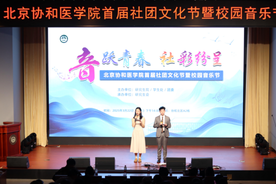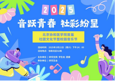 为落实院校党委关于“文化建设年”的总体部署,全面推进6大行动及20项活动,2025年3月22日,由研究生综合处、学生处、团委主办,研究生会承办的首届社团文化节暨校园音乐节在北区A2栋圆满举办。此次活动以“音跃青春,社彩纷呈”为主题,既是校园文化建设年“特色校园文化品牌提升行动”的重要实践,也是深化“爱娃工程”、关怀协和学子成长的具体举措。通过社团文化展示、互动游园、舞台演出等多种形式,400余名师生共聚一堂,在青春跃动的音符与多元文化的交融中,奏响协和人文与医学并重的时代强音。