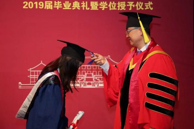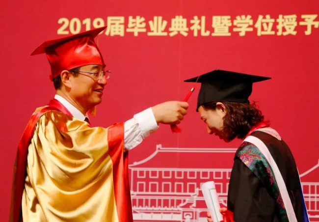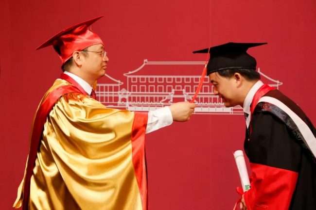 在随后的学位授予仪式上,参加典礼的领导为毕业生拨流苏,授予学位并合影留念。