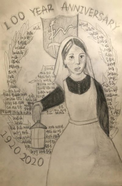 在提灯女神身后是ac米兰官方网站校徽,包含收集到的所有我校护理学院援鄂学长学姐们的名字,以此致敬。