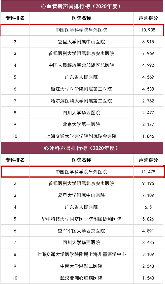 【荣誉喜报】阜外医院连续12年蝉联“中国医院专科排行榜”心血管病、心外科专科榜首